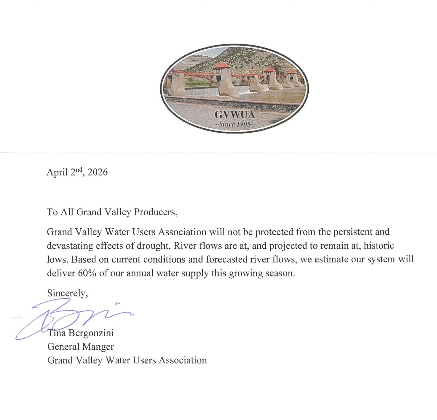 GVWUA has participated in past pilot projects exploring voluntary, temporary and compensated conservation and been willing participants in numerous water-saving endeavors. The determined and nimble producers in the Grand Valley understand the importance of conservation, living within what the river provides, and they acknowledge a drier and hotter climate will bring changes to their operations and to our communities. However, the Lower Basin states need to recognize these hydrologic realities and make the changes necessary to correct the system they have failed through chronic and continued overuse. GVWUA will not ask our producers to bear the burden of Lower Basin mismanagement and their continued denial of the realities in front of them.