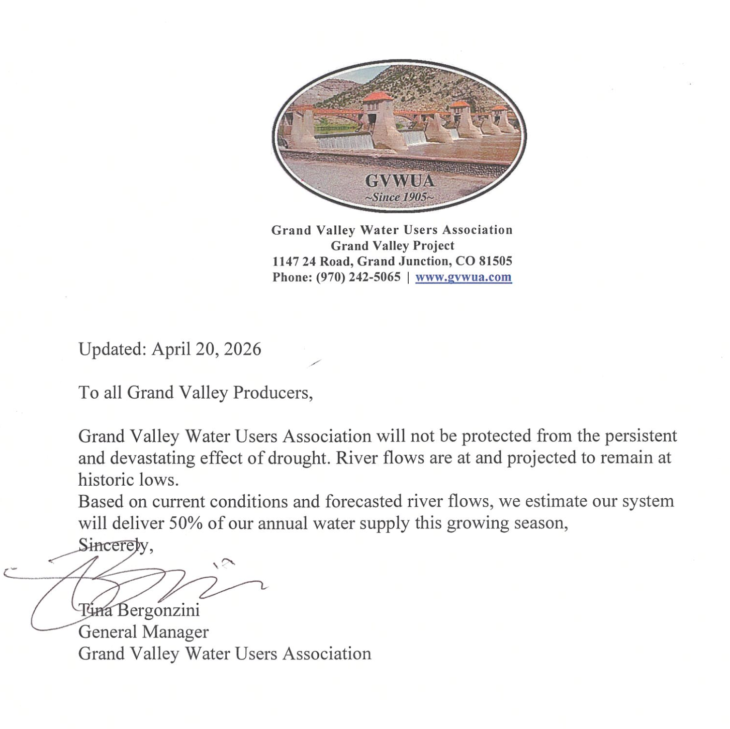 If you have additional questions, my door is open. Please email me at tbergonzini@gvwua and I will respond as quickly as I can.